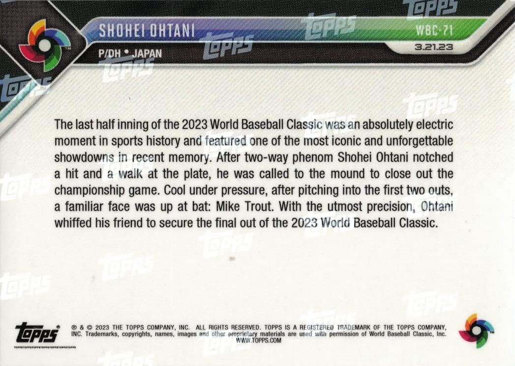 2023 Topps Now #WBC-71 Shohei Ohtani Strikes Out Mike Trout Baseball Card - World Baseball Classic - Team Japan - "Troutani". This is an original, authentic Shohei Ohtani baseball card produced by Topps in 2023. According to Topps, 42,273 of these cards were produced. Card is in Near Mint to Mint condition. Stock photo shown.