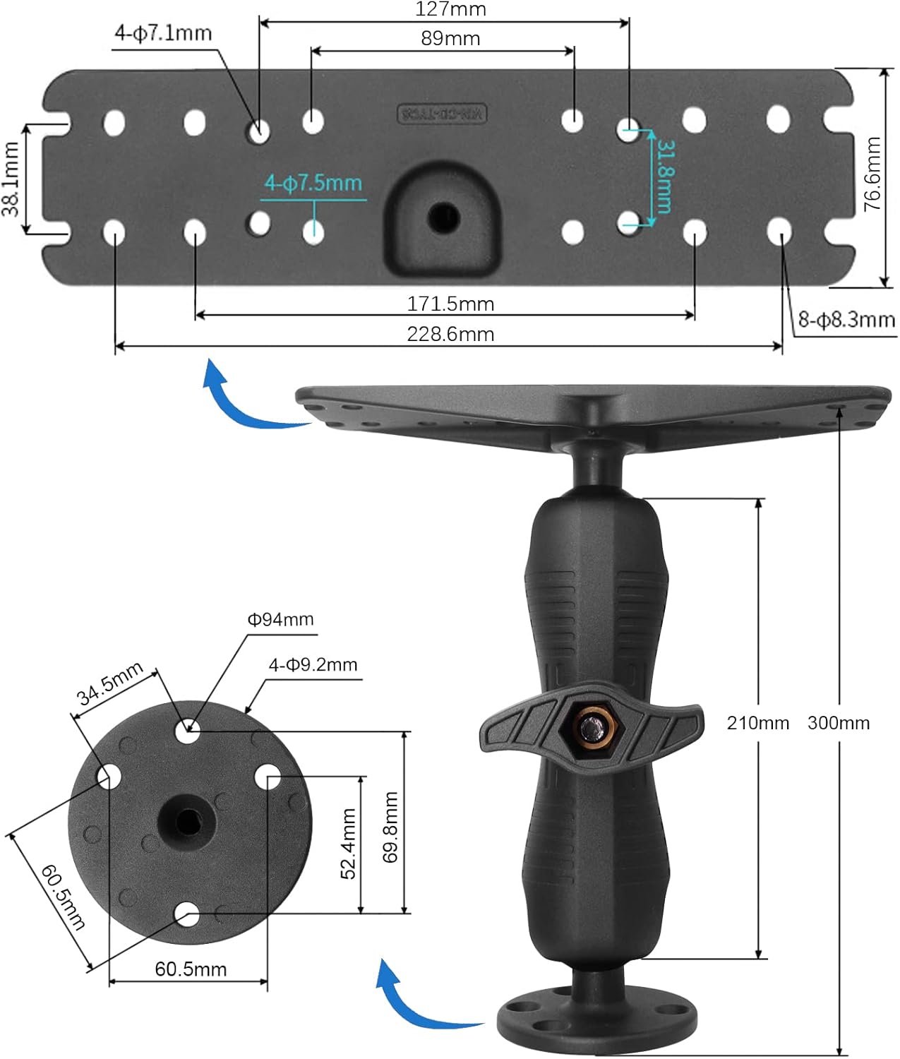 | BuiltIn Media | 2.25" Ball Devices Mounting Plate, 2.25" Ball Round Plate, 8.3" Double Socket Arm, Wrench |