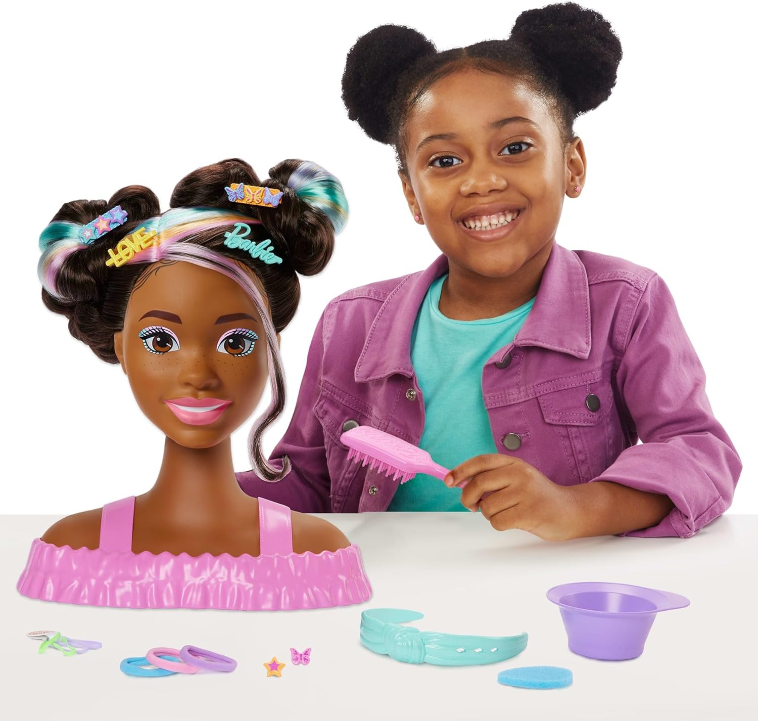 Become a hair expert with the colorful Barbie Doll Styling Head! Barbie has blonde hair with pastel pink, orange, and turquoise streaks through her hair! Including a bowl and sponge to help with color change reveals, Barbie can make her hair clips match her colorful hair. Her other colorful accessories, like her hairbrush, hair ties, and barrettes, help kids make their artistic hair visions come to life! This styling head makes a great gift for kids ages 3 years old and up! Colors and decorations may vary.