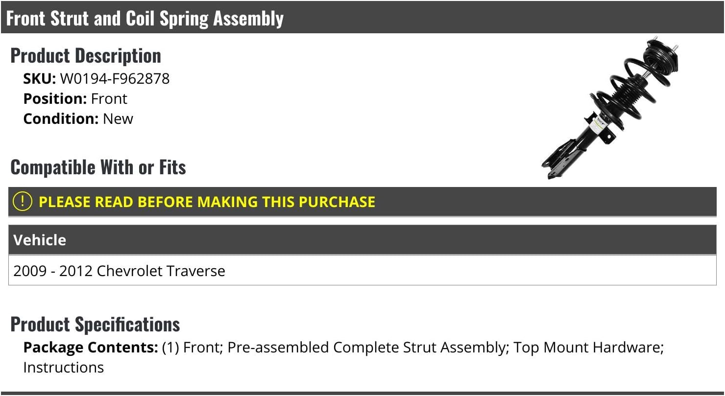 Front Strut and Coil Spring Assembly - Compatible with 2009 - 2012 Chevy TraversePosition: FrontPackage Contents: (1) Front; Pre-assembled Complete Strut Assembly; Top Mount Hardware; InstructionsCompatible With or Fits: - 2009 - 2012 Chevy Traverse