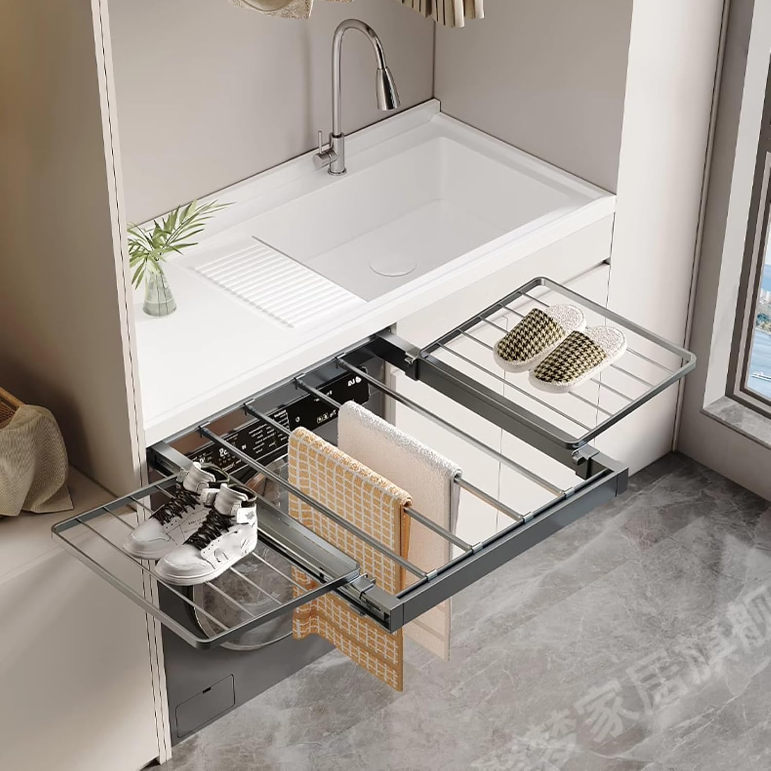 Retractable Pull-Out Pants Drawer & Hidden Drying Rack Above Washer - Space-Saving Wardrobe Organizer with Adjustable Length (22-24 inches) for Efficient Laundry Storage